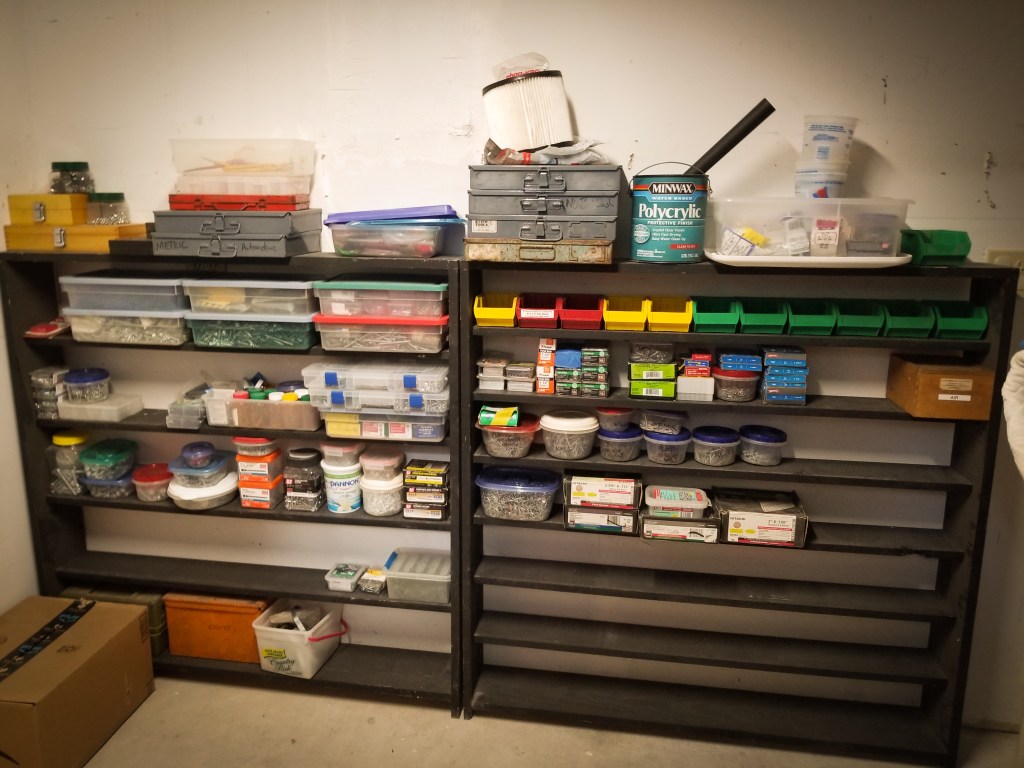 Now, having some space to start arranging all the little containers of fasteners she had sorted, the workshop is progressing toward a usable state.