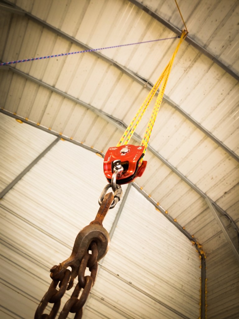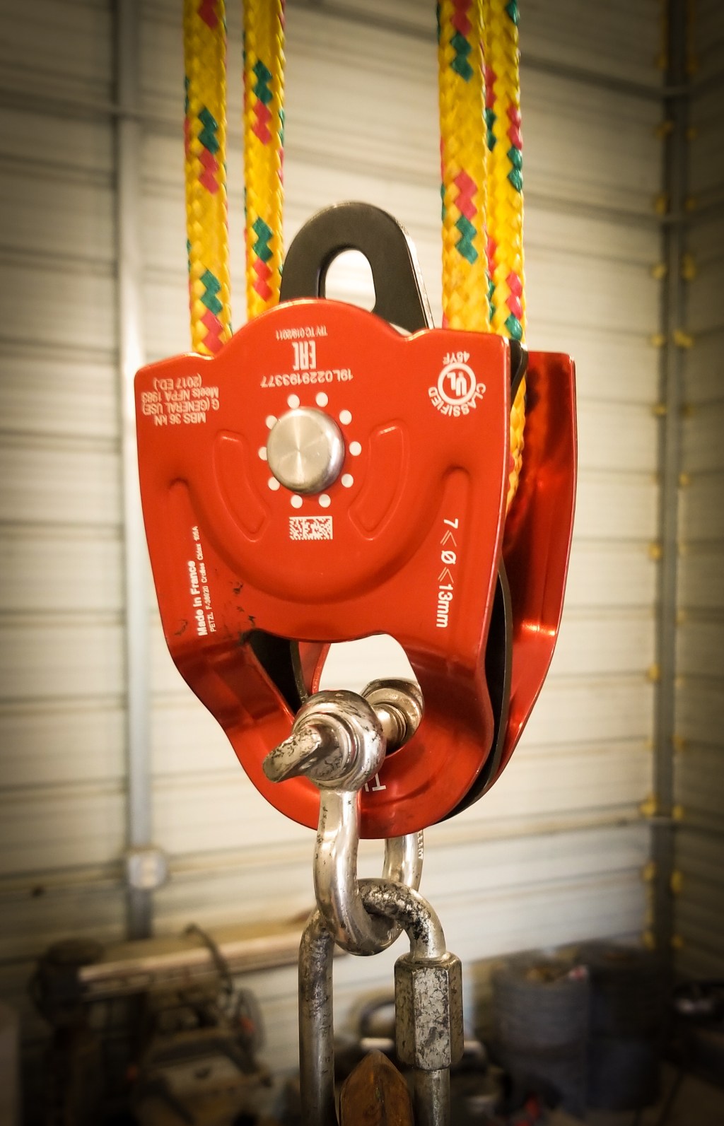 It took a fair amount of ingenuity to safely attach the system to the peak of the roof. I got very close using a nut tied on a string launched from a slingshot, but close is never good enough. I looked around and noticed a few fishing poles left over from all the stuff we had removed and had an idea. I tied the nut and string to the end of the fishing line and standing on the deck of the scaffold, the fishing pole was just long enough to push the nut through the small gap at the peak of the rafters. Once it had fallen through the opposite side, I used the string to pull a heavier rope through the gap and hoist one end of the pulley system into place. Success!