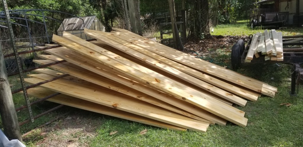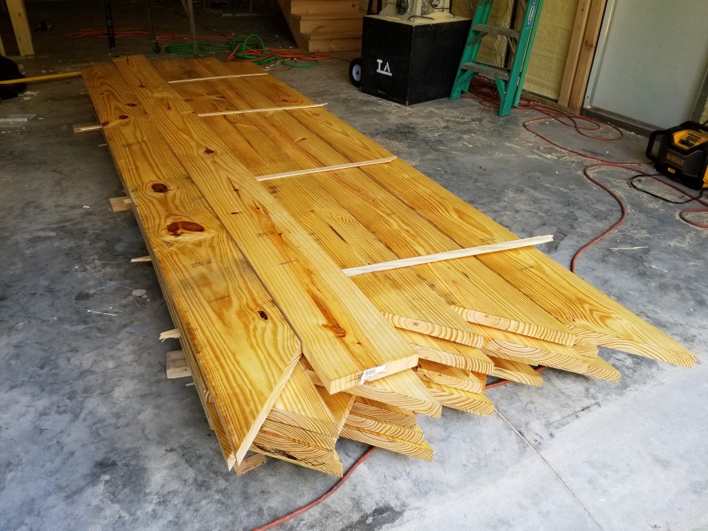 After a quick huddle with Chris, we got to work. Since the flooring lumber was stacked on top of some of the framing lumber, we had to move it. We decided if we were going to re-stack it, we may as well prep it at the same time, squaring the edges with the table saw and miter cutting one end. 40 boards later and we had it prepped and stacked inside the building where we could work around it.