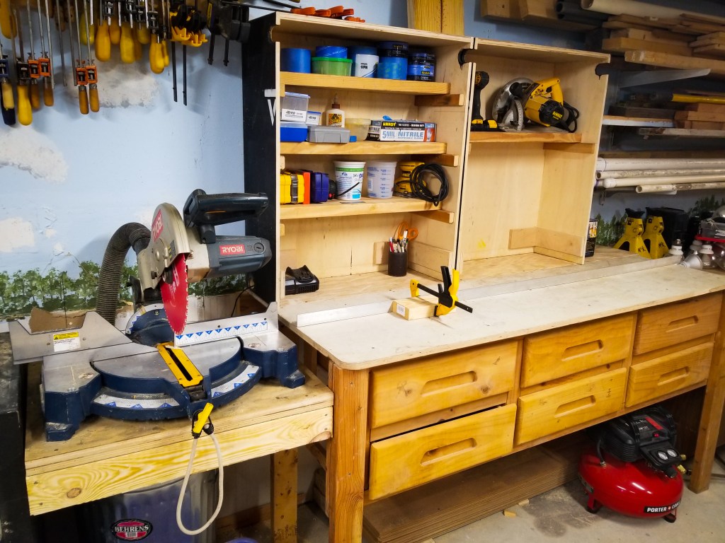 This past weekend was no exception. Our goal was to tidy up some details prior to tackling the second story and ceiling framing. Arriving the afternoon of Friday, we knocked out some of the smaller projects. My lovely wife worked at installing the rest of the dowels that would conceal the screws holding our loft floor together, and I made some modifications to my miter saw setup, so it would be more accurate and useful. As it was previously mounted on a moveable pedestal, I mounted it to the wall, and anchored a fence to the counter next to it, so that a stop block could be clamped in place for repeated, identical cuts. Not wanting to waste the box that it had been originally mounted on, I cut that in half and mounted some shelves inside it for organization. All in all, I was quite pleased with the new setup.