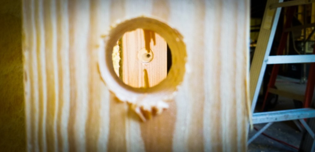 The next phase of our build was pre wiring the place for electricity. This was accomplished over two weekends of work. The first step was plotting the course of the circuits and boring the desired pathway through the framing.