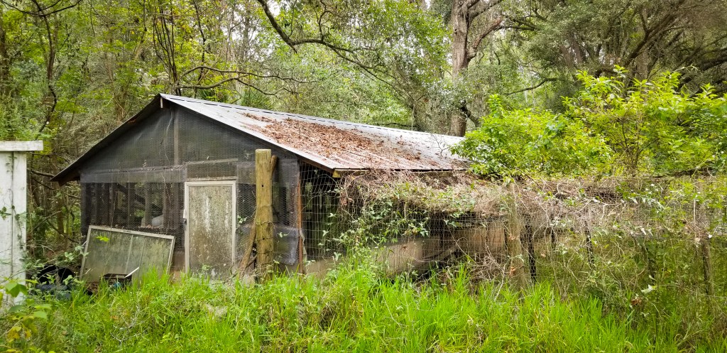 There is also an old greenhouse that my father had constructed many years ago. We recovered a bunch of tempered glass panels during our cleanup that were used for the original roof covering. The glass roof had eventually been replaced with a tin roof and the building was converted into a chicken coop. As there are no chickens currently, it has become a storehouse of old odds and ends. The building has good bones, with a low cinder block wall, good framing, and solid roof. Once we get it cleaned out, my plan is to convert this into a sawmill for processing timber.